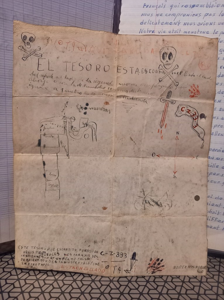 La maison était abandonnée, sans personne. Des papiers sur le sol dans toutes les pièces. Les parents nous demandèrent aux jeunes de les ramasser et de les brûler sur un coin du champ à côté. Pendant que je ramassais les papiers, je trouvais un morceau de parchemin plié et une fois que je le dépliais j’ai été surpris de lire en grosse lettre un peu coloriée au crayon « Plano del tesoro de Juan Arsis Pirata de la marina Inglesa y es para mis descendientes ».